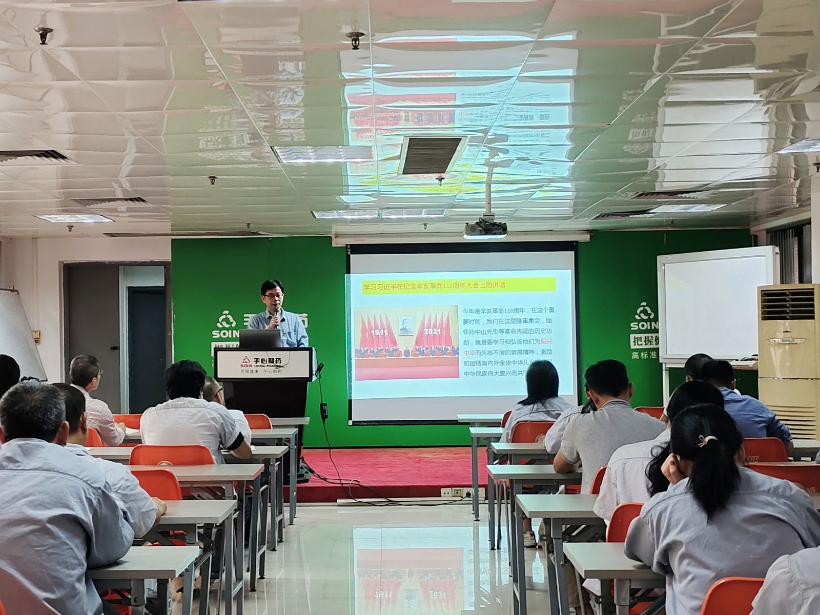 为了学习和弘扬孙中山先生等革命先驱为振兴中华而矢志不渝的崇高精神,激励和团结海内外全体中华儿女为实现中华民族伟大复兴而共同奋斗,把握历史大势,掌握历史主动,10月28日,佛山草莓APP视频网站制药有限公司党委第一书记温国坚为我司开讲党课《学习习近平在纪念辛亥革命110周年大会上的讲话》。