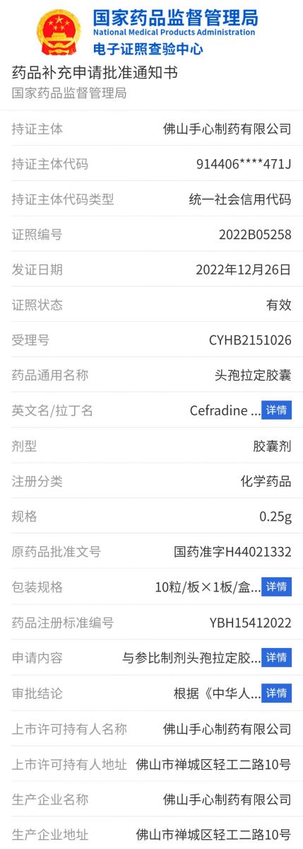2022年12月29日,佛山草莓APP视频网站制药有限公司收到国家药品监督管理局12月26日核准签发的《药品补充申请批准通知书》(受理号:CYHB2151026,通知书编号:2022B05258),佛山草莓APP视频网站制药生产的头孢拉定胶囊(0.25g)正式通过仿制药质量和疗效一致性评价。