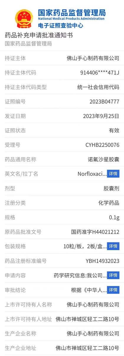 2023年9月27日,佛山草莓APP视频网站制药有限公司收到国家药品监督管理局9月25日核准签发的《药品补充申请批准通知书》(受理号:CYHB2250076,通知书编号:2023B04777),佛山草莓APP视频网站制药生产的诺氟沙星胶囊(0.1g)正式通过仿制药质量和疗效一致性评价。