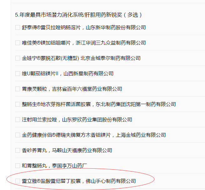 滑至第5项“年度最具市场潜力消化系统/肝胆用药新锐奖” 时,为雷立雅®盐酸雷尼替丁胶囊投上神圣的一票吧!!!